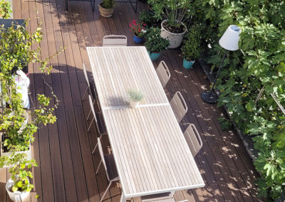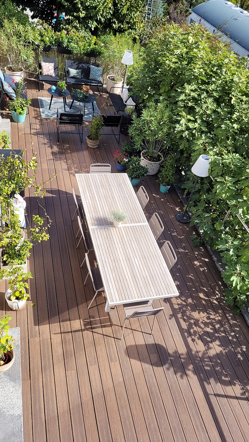 - 4 espaces extérieurs: une terrasse plein sud de 42 m2, une tonnelle ombragée de 51 m2 orientée sud-ouest, une terrasse de jeu avec pelouse artificielle de 37 m2 (sud-ouest) et une pelouse/terrasse/jardin de 85 m2 à l’arrière de la villa.